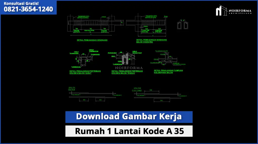 Untuk sahabat Noirforma yang membutuhkan referensi gambar kerja rumah 1 lantai, kami menyediakan Gambar Kerja Kode A-35 lengkap dalam format DWG AutoCAD.